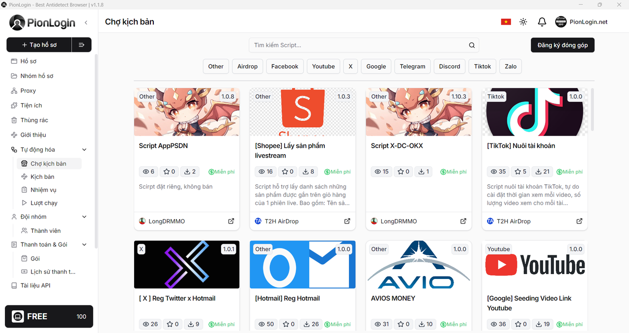 • → PionLogin: Giúp bạn tạo ra vô số môi trường làm việc độc lập và an toàn, giải quyết triệt để bài toán browser fingerprint.