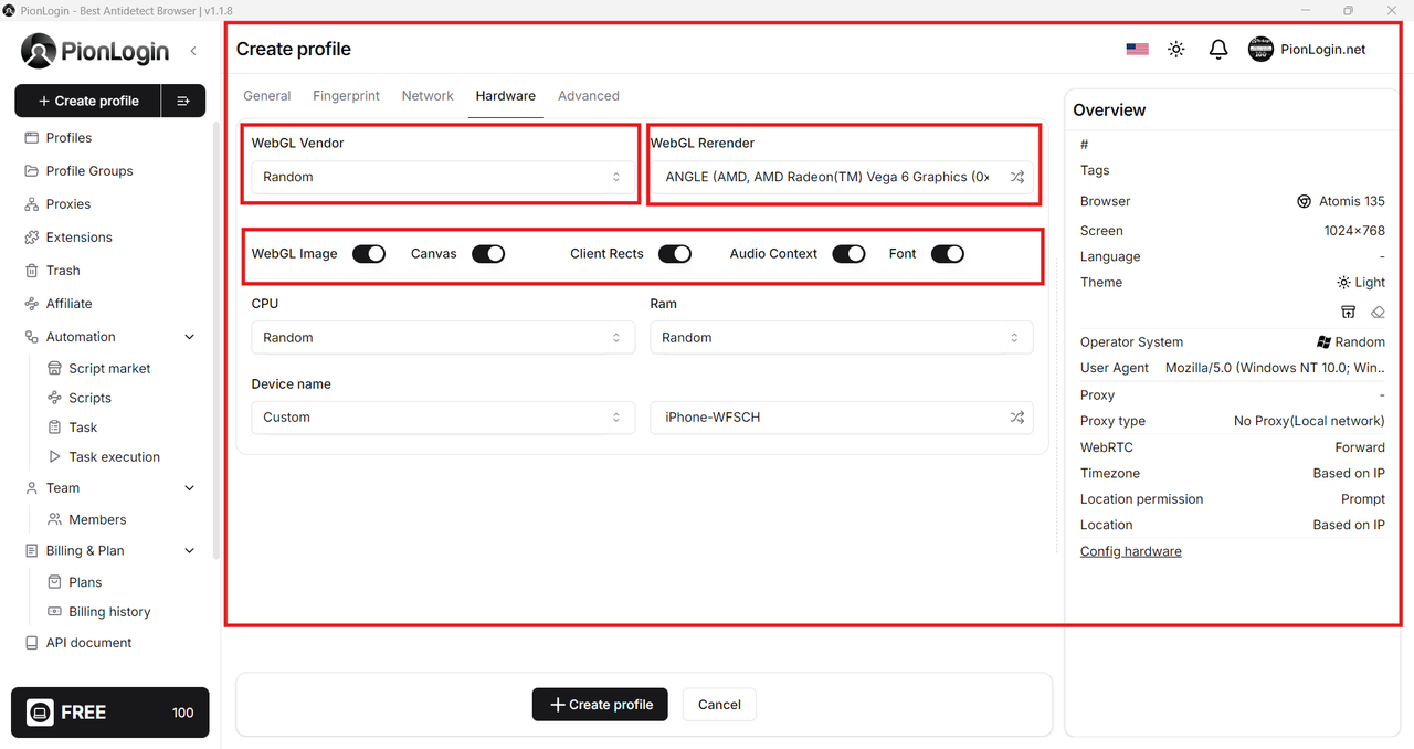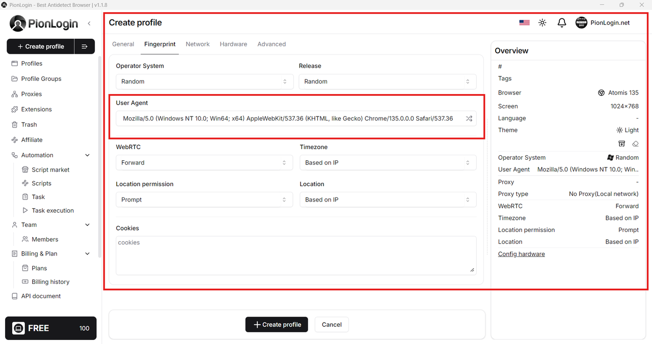 Thay vì tạo ra các thông số ngẫu nhiên, vô nghĩa, PionLogin sử dụng một cơ sở dữ liệu khổng lồ chứa các thông số của hàng triệu thiết bị người dùng thật trên toàn thế giới. Khi bạn tạo một profile mới và chọn cấu hình, ví dụ "Máy tính Windows 11 dùng Chrome 125", PionLogin sẽ gán cho profile đó một bộ fingerprint hoàn chỉnh và logic, từ Canvas, WebGL, AudioContext, Fonts, cho đến User-Agent... tất cả đều tương ứng với một chiếc máy tính thật ngoài đời.