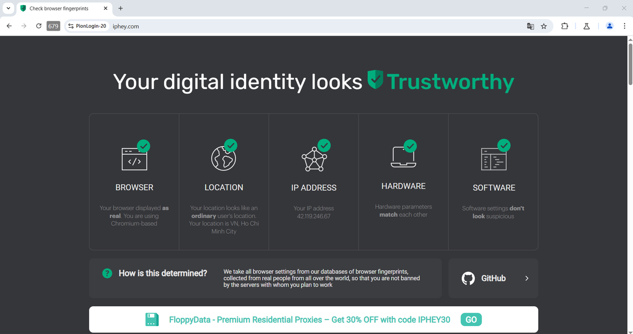 PionLogin: Giả lập Browser Fingerprint đạt 99% an toàn từ kiểm tra Iphey